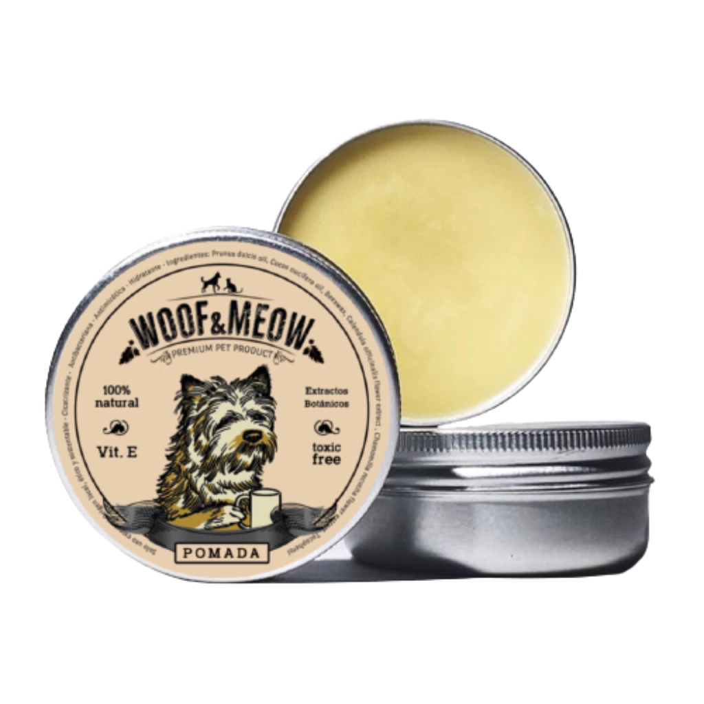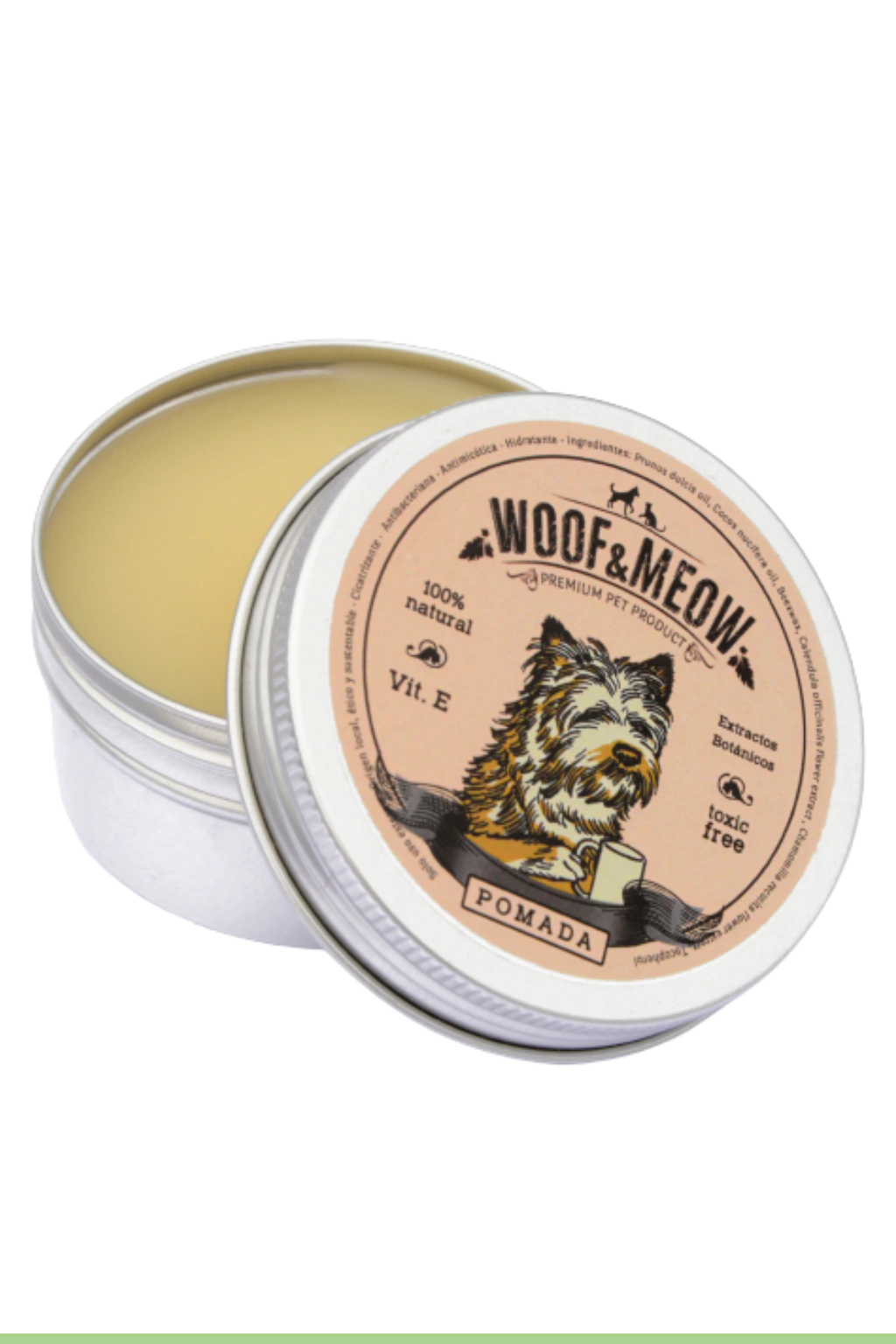 La Pomada Hidratante orgánica de Woof y Meow es totalmente natural, especialmente formulada para tratar y prevenir afecciones y molestias de la piel.